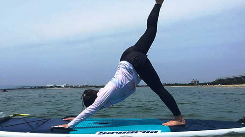 在浮浮沈沈的水上,乘坐SUP板上进行瑜珈运动,比在地上更能锻炼身体,达到更好的健身效果。其他比起在健身房和室内进行一般的瑜珈,在无边际的海上感受大自然风情,更能达到放轻松丶消除疲劳的功效。