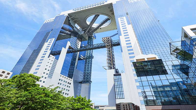 天空大厦周围有阪急梅田总店、阪神梅田总店、Grand Front Osaka和Kids Plaza Osaka。