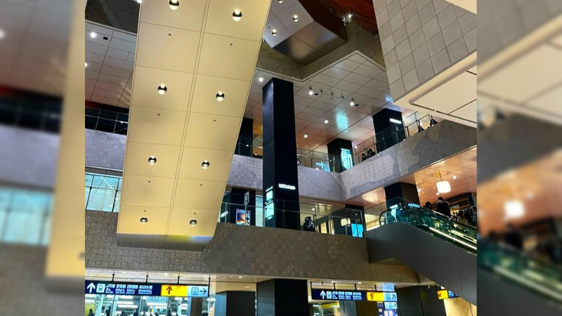 这个由Lumine设计的大型购物中心有一个大型自动扶梯,并能看到车站月台的景色
