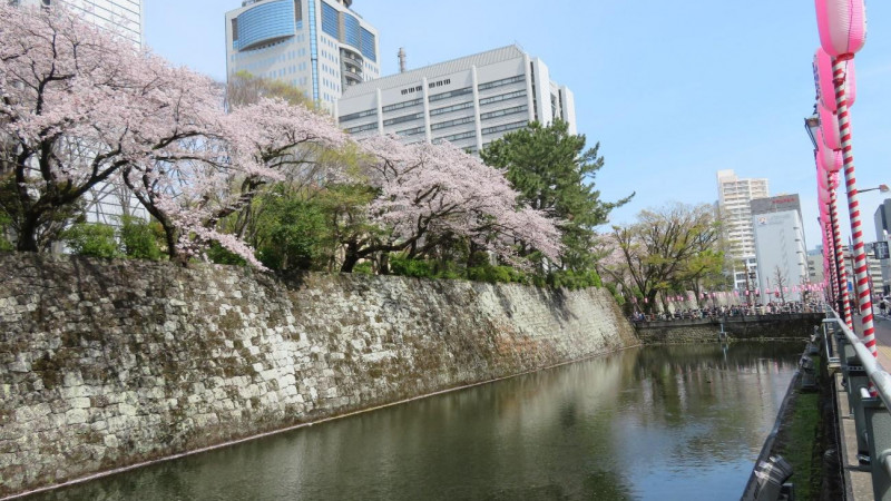 二之丸护城河被开凿在孙普城堡公园的南侧,那里的水面很平静。从护城河中升起的石墙两旁种有樱花树,在平静的水面上反射出早春的色彩。