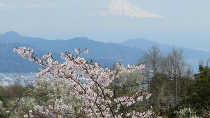 从露台上看,松原美穗、清水港、伊豆半岛和南阿尔卑斯山的全景都在下面展开。在樱花盛开的季节,你可以在浅红色的花丛中仰望骏河湾上的富士山。