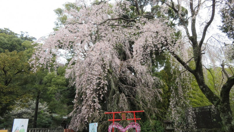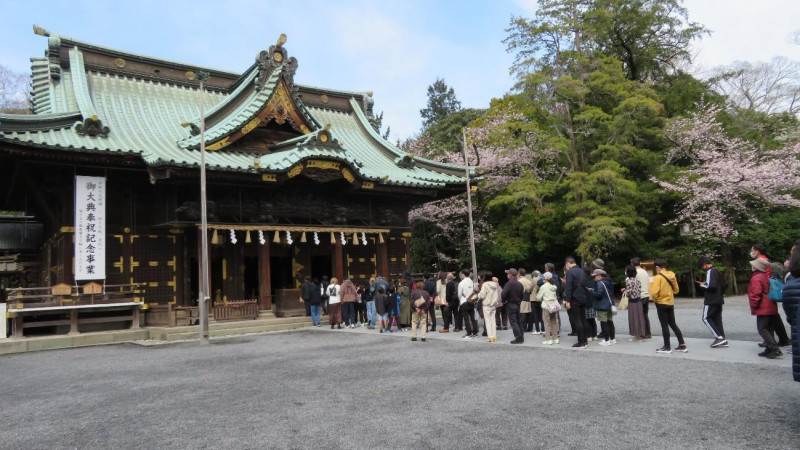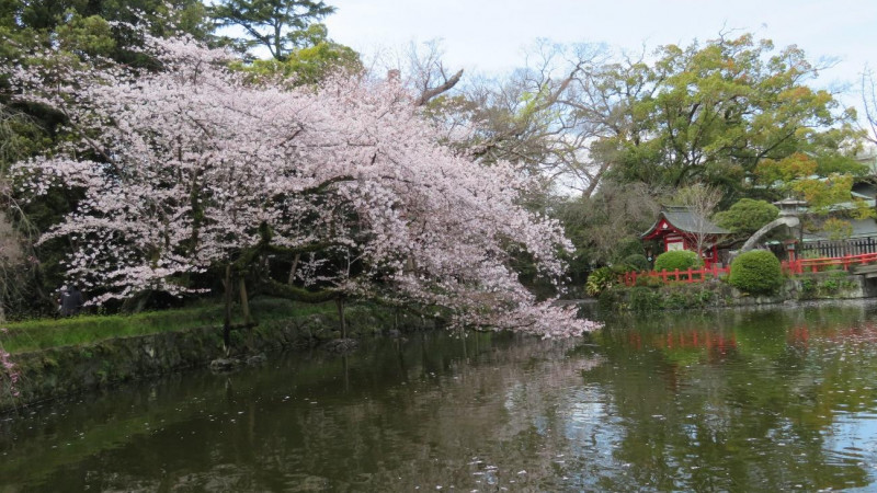 神社里生长着大约15个品种的樱花树,主要是染井吉野,也有川津樱、八重樱、志田樱、三岛樱和大岛樱。通常从3月底到4月初,整个地区被染井吉野樱花染成浅红色,但川津樱花在2月中旬左右开花,八重樱花在4月中旬左右开花,所以赏樱季节要长一些。在一年中的不同时期反复游览,可以看到不同的风景。在赏樱季节,通往寺庙的道路两旁有许多摊位。到了晚上,这条路被点亮,游客可以全天欣赏樱花,不分昼夜。