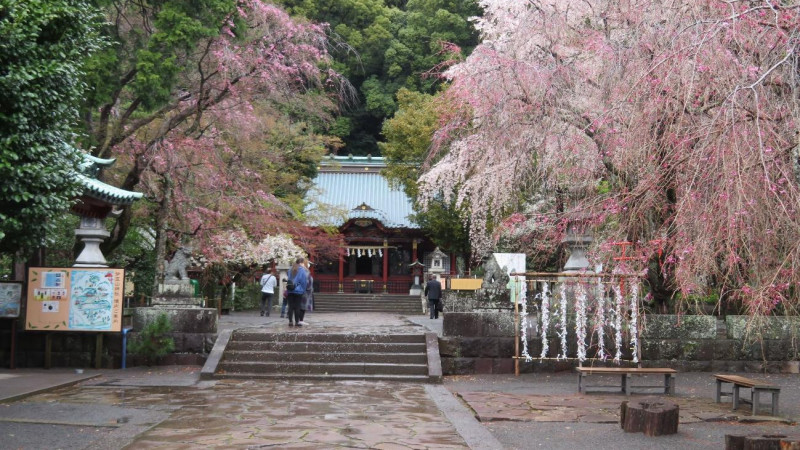 伊豆山神社位于热海市的伊豆山上。神社的创建日期并不确定,但根据神社的传说,它可以追溯到公元前5至4世纪,即高明皇帝统治时期。神社的院子里生长着大约70棵樱花树,它们的浅红色花朵通常在三月底到四月初装饰院子。