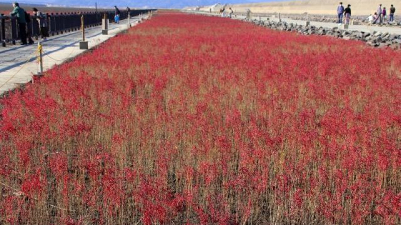 佐贺县的Shichimensou no Sato是有明海海岸的一个壮观景点。七门草是一种生长在潮滩上的稀有植物。深秋时节,当天气逐渐转凉时,有明海沿岸的道路被七叶草染成鲜红色。七叶树的红色和有明海的蓝色形成了一种美丽的对比。开车经过它们是可以的,但如果你想全力以赴,可以在七门楼附近散步。