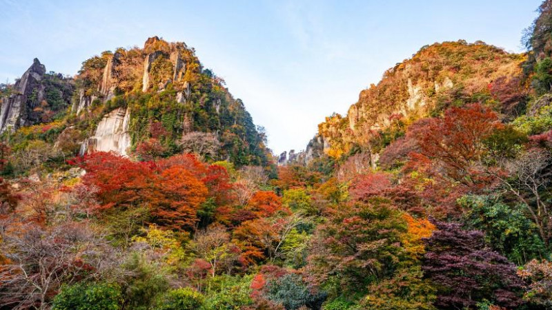大分县的八百景峡谷提供了一条具有壮观峡谷之美的驾车路线。最佳的游览时间是在秋天,那时的红叶很美。在 "八景一瞥 "景点,可以看到奇形怪状的岩石和秋叶的美丽景色。白色岩石表面覆盖着五颜六色的树木,这种景象确实很壮观。之后,你可以沿着山谷欣赏秋叶,享受驾车的乐趣。