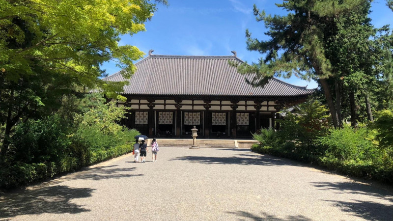 穿过南大门,首先迎接你的是近藤堂。里面有一尊鲁山武的坐像、一尊药师娘的雕像和一尊千手观音(千手观音)的雕像,营造出一种肃穆的气氛,而寺庙的规模之大,让人很难相信是在1200年前创建的。再往里走,有一个讲堂、鼓楼和其他建筑,如果你再往里走,你会发现上条和尚的坟墓。与奈良著名的旅游景点如东大寺和春日大社不同,这个世界文化遗产提供了一个更安静的氛围。