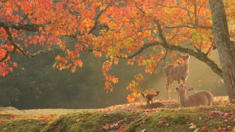 此外,如果您去奈良公园,一定不能错过拍摄鹿和红叶。基本上,公园里的任何地方都可以拍到鹿和红叶,但如果您想选择鹿比较多的地方,我们推荐您去朝歌原公园,它位于春日大社主入口的南侧!到了秋末,您可能会看到鹿在枫树和银杏树的地毯上休息。