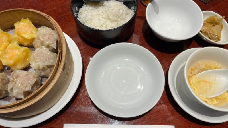 一份套餐包括八块虾肉烧卖(四块虾肉和四块肉烧卖)、汤、小米菜和米饭。