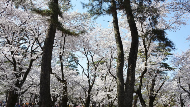 公园里生长着各种各样的花草树木,但樱花树最密集的地方是中央自由广场。从高空俯瞰广场,仿佛形成了一个浅红色的天然屋顶。在樱花树中,还可以看到许多巨大的红松树,常青树细长的绿叶与樱花淡红色的轮廓形成柔和的曲线,仿佛相依相偎。
