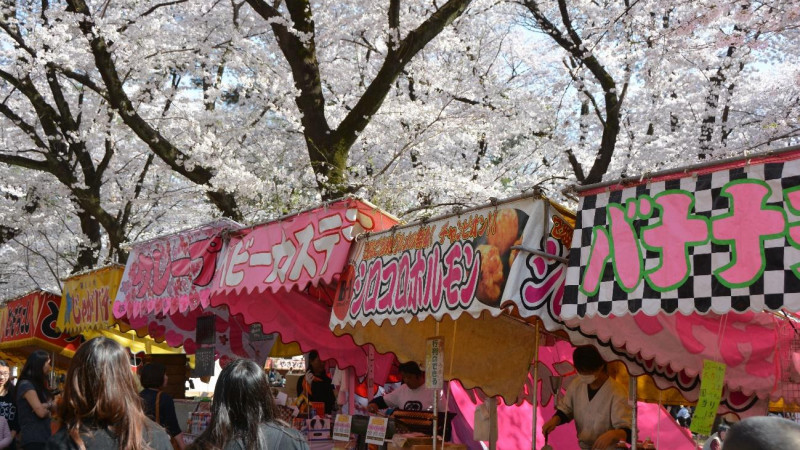 樱花盛开时,大宫公园日夜都挤满了赏樱的游客。每年约有 130,000 人前来游览。自由广场被改造成宴会厅,您可以在这里摆放休闲座椅,享用美食和饮料。由于严禁烟火,所以不允许烧烤等,但也不太可能看到很多人在唱卡拉 OK,所以这里很可能是一个安静的赏樱场所。广场周围有各种各样的摊位。超过 100 个摊位是常有的事。烤鸡肉串、什锦烧、炒面、章鱼烧、土耳其烤肉串、泰国菜,甚至还有猪肉味噌汤等汤类,就像在市中心一样。有时还会出现出租摊位,因此即使您空手而来,也可以在广场上坐下来。