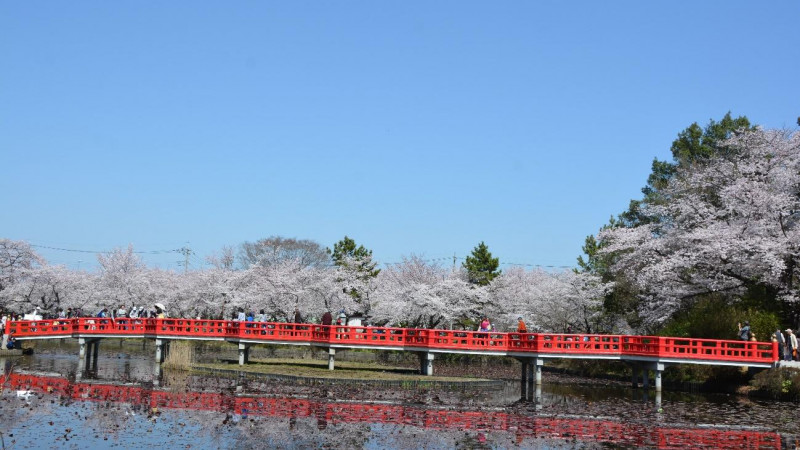 岩月城下公园的最大特色是公园中央水面平静的鸢尾池上参差不齐的八桥。八角朱漆桥连接池塘两岸。过桥后,360° 的樱花美景尽收眼底。桥上鲜艳的朱红色和樱花的淡红色轻轻地融合在一起,形成一种色调上的平衡。