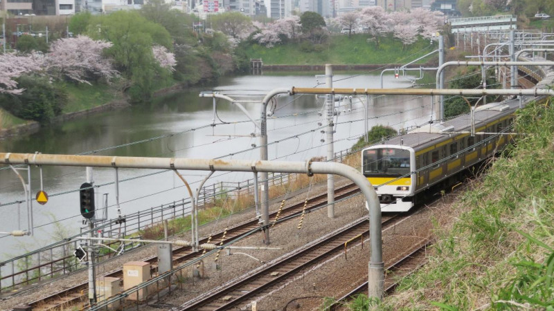 外护城河公园的樱花不仅可以沿着长廊漫步欣赏,还可以在电车上观赏。JR 中央线和总武线横穿公园。在饭田桥站和四谷站之间的电车上,樱花常开不败,4 分钟的车程是赏樱的最佳时机。透过车窗观赏樱花,也许会让您的通勤列车之旅更加惬意。如果您是铁道迷,这里是您不容错过的景点。