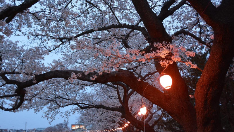 樱花盛开时,河畔长廊的上空会悬挂纸灯笼。到了晚上,灯笼被点亮,樱花也被照亮。柔和的灯光照耀下的樱花夜景美不胜收,而盂兰盆灯不断亮起的景象也令人着迷。一排排樱花树下摆满了小摊,您可以一边品尝美食,一边欣赏樱花。