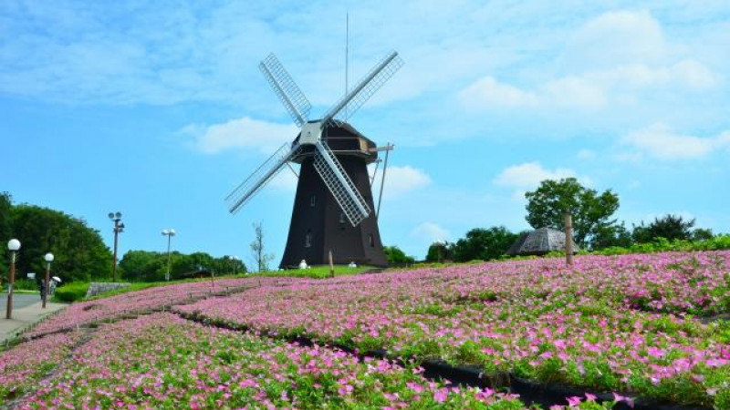 公园标志性风车前的广场四季色彩缤纷,春天有郁金香,夏天有丹参,秋天有波斯菊。「与大池塘」西侧相邻的是「大草坪」、「绿色溪流」和「杏树林」。「杏树林」种植了一排约 100 棵杏树,通常在 3 月至 4 月间绽放绚丽的色彩。「游乐场「鹤见湖公园」与杏树林」北面相邻,里面有许多独特的游乐设施,包括日本第一个大型游乐设施「巨蛋」。「大草坪」西面的区域是「露营地」和「烧烤区」。