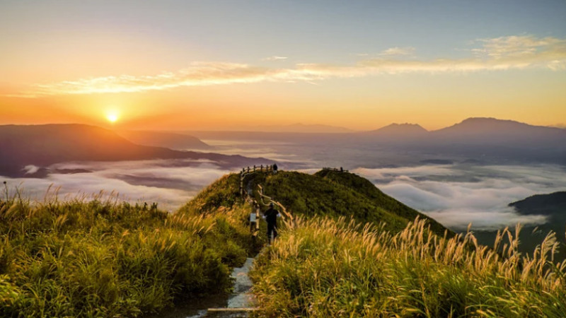 "The Aso Five Mountains seen from Daikanbong "are called "Nirvana Statue "because they look like a sleeping Buddha. Feel the power of the earth from the view of the five Aso peaks. In the early morning of autumn and winter, a sea of clouds can be seen. The sun rising over the five Aso peaks and the sea of clouds in the clear air is a beautiful sight that will recharge your power.