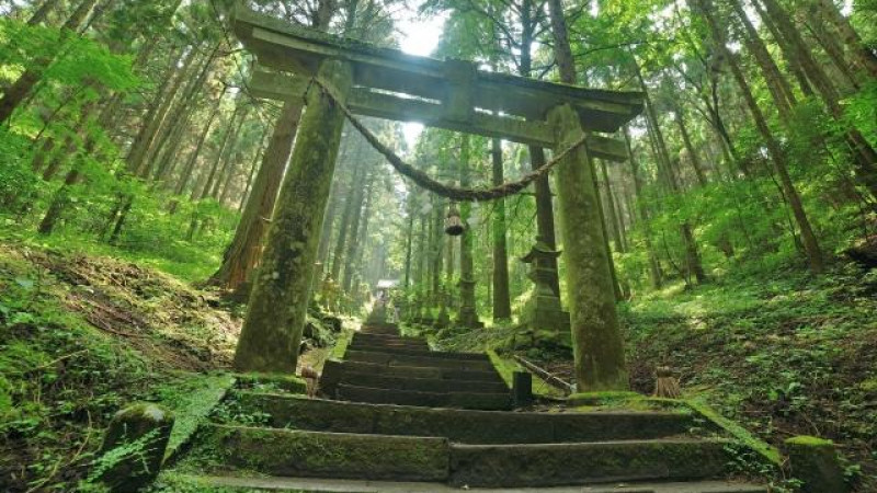 "Kamishiki Kumanoza Shrine "enshrines the husband and wife deities "Izanagi-no-mikoto "and "Izanami-no-mikoto ". The approach to the shrine is surrounded by a grove of cedar trees, creating a quiet and solemn atmosphere. The stairs to the shrine are moss-covered, even the stone lanterns on either side of the stairs are covered with moss. As you walk up the approach overflowing with greenery, you will feel peaceful by the time you reach the shrine.