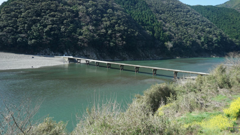 "The submerged bridge "is designed to sink into the water when the river rises. It is a simple bridge design with no parapets (railings), which are usually found at both ends of bridges. When the river rises, the submerged bridge sinks into the water and looks as if there were no bridge there. Because of their simple design, construction costs can be kept down, and even if they break, they are easy to repair.