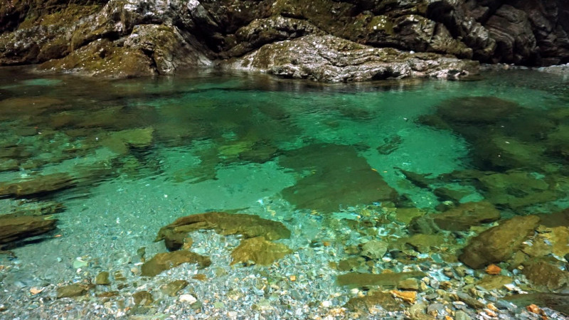 The best place to enjoy Niyodo blue is "Shokubuchi ". The transparency of the water is so high that when the sun shines through it, the water looks emerald blue, like crystal. The blue or green color of the water, depending on the time of day and the weather, is also a highlight. Because of its high transparency, the water appears shallow, but it is at most 2 to 3 meters deep.