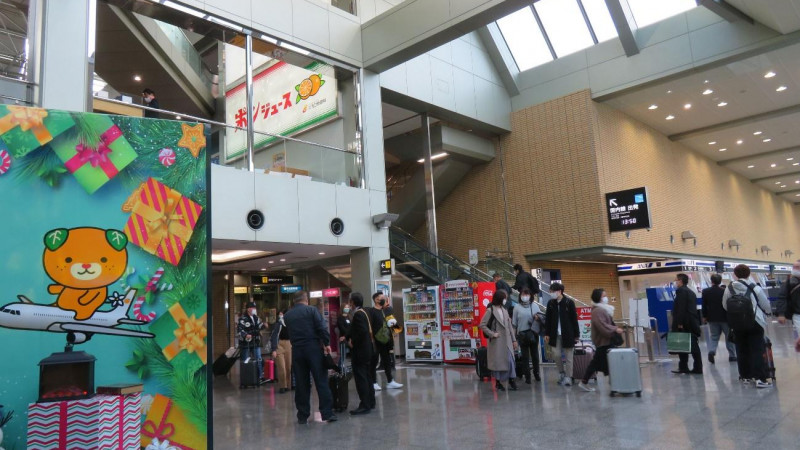空港施設は、1階中央の到着ロビーを境にして、左手にJAL、Jet Star、右手にANAのカウンターが設置されています。出発ロビーは1階に設けられ、その左右は土産物店、レストランのエリアです。1階には、四国八十八ヶ所巡りやサイクリングを目的とする利用客のために、更衣室が準備されています。