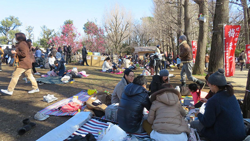 매화꽃이 만개하는 시기에는 중앙 광장에 돗자리를 깔고 음식을 즐기는 사람들로 붐빈다.