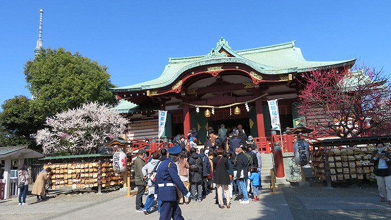 참배길의 남쪽 끝, 오토리이(大鳥居)에는 다이코바시(太鼓橋)가 놓여 있다. 다리袂에는 주홍색 타이코바시, 매화나무 끝에는 도쿄 스카이트리가 우뚝 솟아 있다.