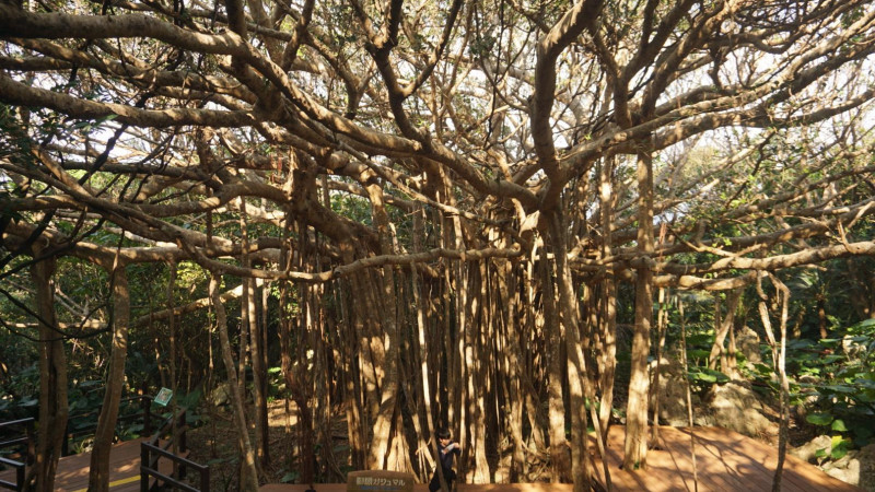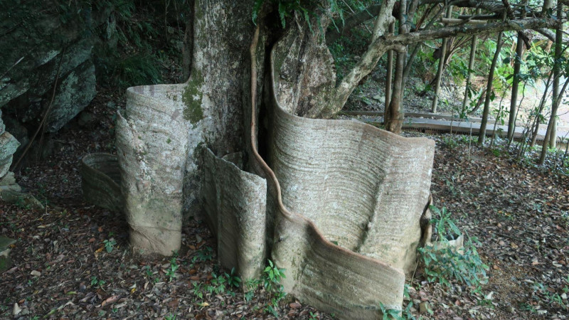 "사키시마스오노키 "는 일본에서는 아마미오시마, 오키나와 본섬, 이시가키섬, 이리오모테 섬에만 서식하는 5~15m에 달하는 큰 상록활엽수다. 특징은 사진에서 보시는 바와 같이, 얇게 주름진 모양을 그리는 거대한 판근이 특징입니다!
