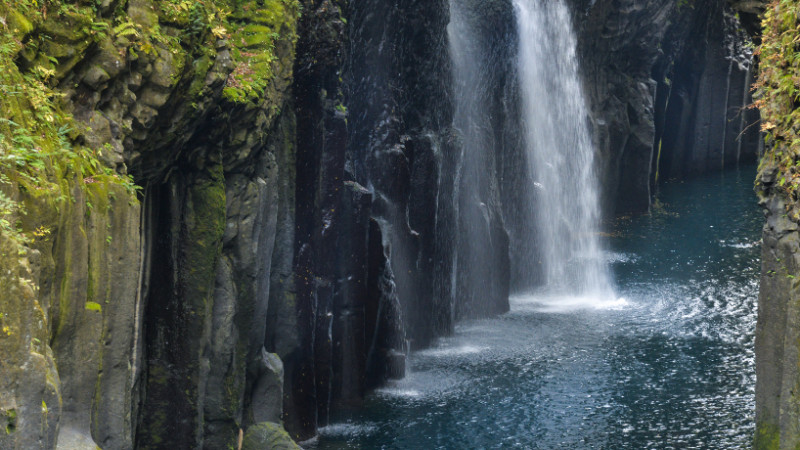 오래전 아소산 대분화 당시 화쇄류가 차갑게 굳어 만들어진 것이 "다카치호쿄 "이다. 80m 높이의 절벽 사이로 맑은 물이 흐르고 있으며, 보트를 타고 협곡 속을 돌아볼 수 있다. "다카치호쿄 "중 가장 유명한 것은 "마나이 폭포 "이다. 일본의 폭포 100선에 선정된 이 폭포는 낙차 17m의 폭포를 보트 위에서 가까이서 볼 수 있다.