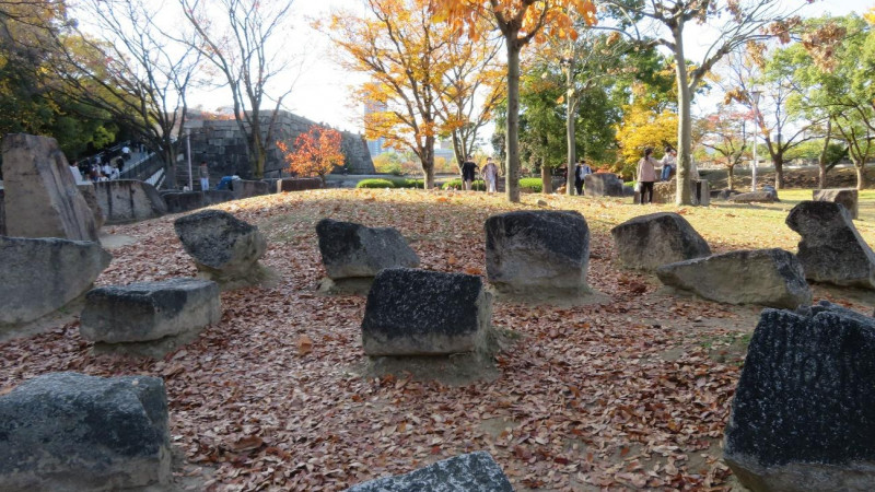 본마루 광장에서 천수각을 넘어 북쪽으로 조금 더 가면 큰 돌이 널브러져 있는 광장이 있다. 마치 아이들의 놀이터처럼 보이지만, 이곳은 '각인석 광장'이라고 불린다. 에도 시대에 도쿠가와 막부는 전국 각지의 다이묘들에게 공사를 맡기는 천하보공(天下普請)으로 오사카성을 재건했는데, 1620년 공사 시작 후 약 10년에 걸쳐 전국 각지에서 대량의 돌이 오사카로 운반되었다. 돌에는 문자와 문양은 물론, 다이묘의 가문 등이 새겨져 있습니다. 오사카성 주변에서는 지금까지 수만 개의 새겨진 돌이 발견되었다고 하니, 공사의 규모를 짐작할 수 있을 것이다. 광장 주변에는 "도요토미 히데요시, 요도덴 등 자결지 "비석과 "요도군 순직자 32명 충령탑 ", "산리마루 돌담의 기총소사 흔적 "등이 있어 역사성을 느낄 수 있다.
