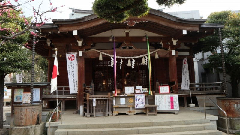 도쿄도 지정 유형민속문화재인 "후지즈카( ")가 있고, 비둘기 운세를 비롯한 비둘기 관련 아이템이 있어 파워 스폿으로도 인기 있는 신사다!