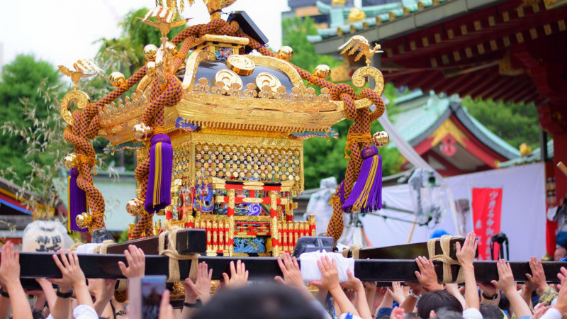칸다마츠리는 도쿄도 지요다구에 있는 칸다묘진에서 격년으로 5월 중순에 열리는 신사 제례이다. 에도 시대부터 전통을 이어온 이 축제는 메이지 시대까지 가마 행렬이 진행되었다. 현재 진행되는 행사 중 가장 큰 규모의 행사는 5월 15일에 가까운 토요일에 실시되는 "신행제 "이다. 오전 8시에 "호렌(鳳輦) "이라고 불리는 3대의 호화로운 가마를 중심으로 한 시대 행렬이 신사를 출발한다. 화려한 의상과 흰색 의상을 입은 시조들이 하루 종일 칸다 거리를 화려하게 행진한다. 저녁에는 가마, 수레, 무사 행렬 등의 가마행렬이 더해져 분위기를 한층 더 고조시킨다. "신행제 "다음 날인 "오코시미야입 "에서는 주변 마을에서 마을 가마가 차례로 신사까지 행진한다.