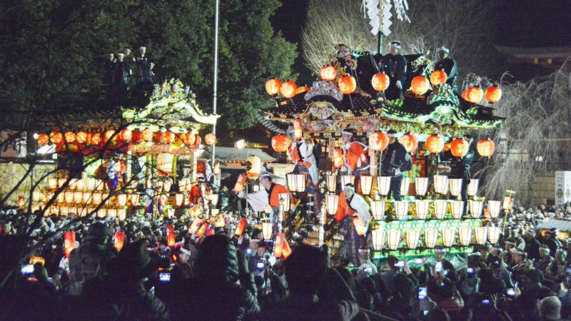 2일의 "전야제 "는 축제 본 행사를 고조시키는 전야제 같은 역할을 하며, 4대의 수레가 시내를 행진하고, 3일의 "대제 "에서는 아침부터 6대의 수레가 행진하고, 오후 7시부터는 치치부 신사에서 신행 행렬과 각 마을회의 수레가 행렬을 만들어 행렬을 이어간다. 신행 행렬, 각 마을회의 수레가 여행지를 향해 행진합니다. 가사호코와 가마는 못을 하나도 사용하지 않고 조립된다. 금색 장식품, 극채색 조각, 후막의 금실 자수로 장식되어 "움직이는 양명문 "이라고 표현될 정도다. 수레가 방향을 바꿀 때는 "기리마키(輓回し) "라는 특수한 방법을 사용해 방문객들의 시선을 사로잡는다.