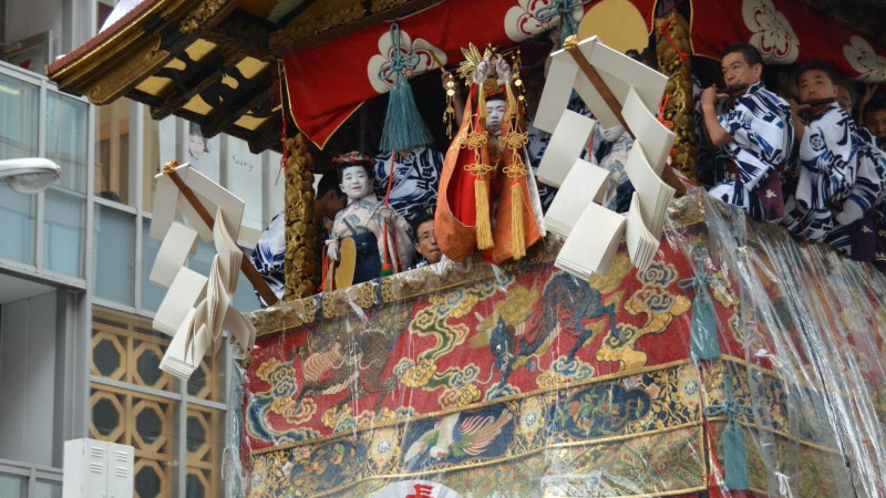 기온마츠리는 매년 7월 1일 "기치부이리 "부터 31일 "역신사 여름越祭 "까지 한 달에 걸쳐 다양한 제례가 열리는 교토시 히가시야마구 야사카 신사의 제례로, 9세기 헤이안 시대 정관 연간에 시작되어 교토의 여름 풍물시로 완전히 자리 잡았습니다. 가장 큰 클라이맥스는 야마호코 순행으로, 17일의 "전제 "에서는 시조카라스마에서, 24일의 "후제 "에서는 카라스마오이케에서 시조도리, 가와라마치도리, 오이케도리를 콘치키친의 기온 하야시 음악에 맞춰 산과 호코가 순행한다. 당일은 일본 국내뿐만 아니라 해외에서도 많은 사람들이 몰려들어 시내가 축제 분위기에 휩싸인다. 수십 개의 산과 호코는 아름다운 자수나 외국의 직물로 장식되어 있어 "움직이는 미술관 "이라고도 불린다.