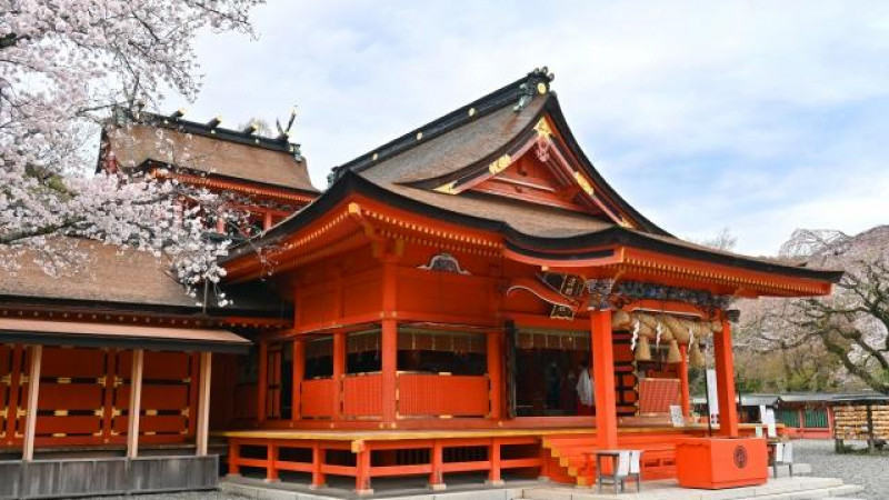 주홍색으로 칠해진 아름다운 본전 안쪽에는 아름다운 후지산이 보인다. 봄에는 경내의 벚꽃이 만개하여 붉은 본전과 후지산, 이 세 가지가 만들어내는 아름다운 경치를 즐길 수 있다. 일본다운 경관을 즐길 수 있는 세계유산이다.