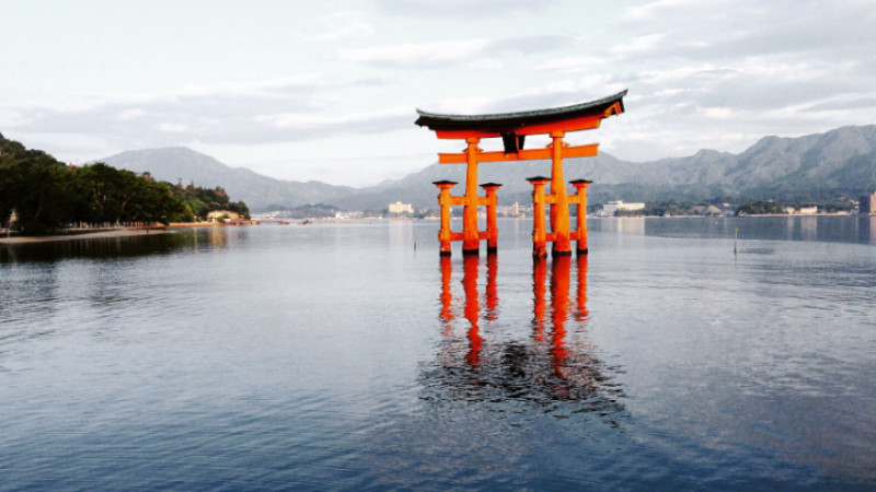 히로시마 본토에서 배를 타고 항구에서 "이쓰쿠시마 신사 "를 향해 걸어가면 바다에 떠 있는 주홍색 도리이가 보인다. 본전까지의 회랑도 바다 위에 떠 있어 지금으로부터 1430년 전에 지어졌다고는 상상도 할 수 없다. 파도 소리를 듣고 바닷바람을 느끼며 참배하면 마음이 깨끗해지는 것 같다.